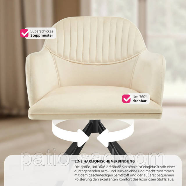 Елегантне крісло, що обертається, з вишуканою оксамитовою оббивкою для неймовірно м'якого сидіння. Великий корпус сидіння, підлокітники та спинка на всю довжину з набиттям із пінопласту високої щільності. Тонкі, надзвичайно стійкі сталеві ніжки із захисним порошковим покриттям.