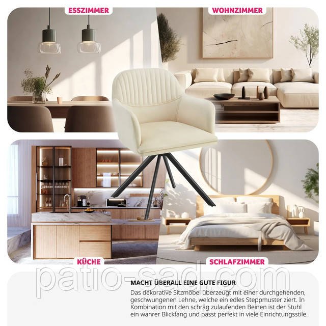Відкрийте для себе елегантне оксамитове крісло Lona, яке ідеально поєднує в собі дизайн, комфорт і функціональність. Він встановлює нові стандарти на вашій їдальні та перетворює її на стильне місце для відпочинку. Цей предмет меблів вражає своїм надзвичайно тонким оксамитовим чохлом, який є не тільки візуальним акцентом, але й у поєднанні з великим корпусом сидіння, а також підлокітниками та спинкою на всю довжину з набиттям високої щільності забезпечує дуже м'яке та приємне сидіння. Особливістю цього універсального крісла є функція плавного обертання на 360°, яка дає змогу плавно змінювати положення в будь-який час. Елегантний зовнішній вигляд підкреслюється тонкими, що обертаються по діагоналі сталевими ніжками, які гарантують максимальну стійкість і виняткову стійкість. Завдяки зручним для підлоги та нековзним пластиковим ковпакам дизайнерський стілець завжди надійно та стійко стоїть на своєму місці. Придбайте оксамитове обертове крісло Lona прямо зараз і розставте ексклюзивні акценти у своїй їдальні.