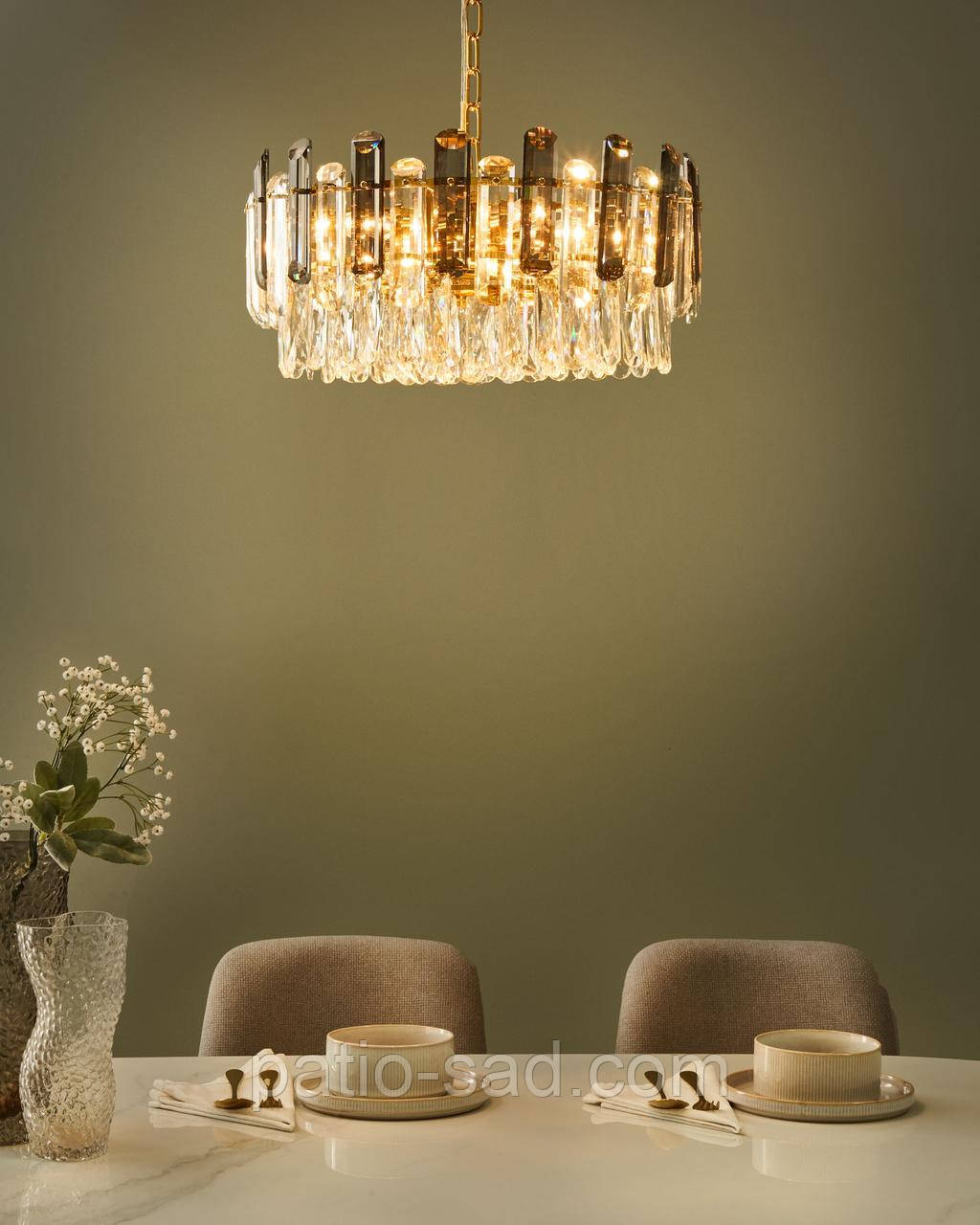Додайте яскравий акцент у свій інтер'єр із цим сучасним підвісним світильником із заліза з оздобленням теплого золотого відтінку. Поєднання прозорих і димчастих кристалів надає світильнику глибини та неповторного характеру. Мерехтливі скляні елементи красиво відбивають світло, створюючи елегантну атмосферу. Цей світильник ідеально підходить для їдалень, віталень або сучасних інтер'єрів, де хочеться нотки гламуру.